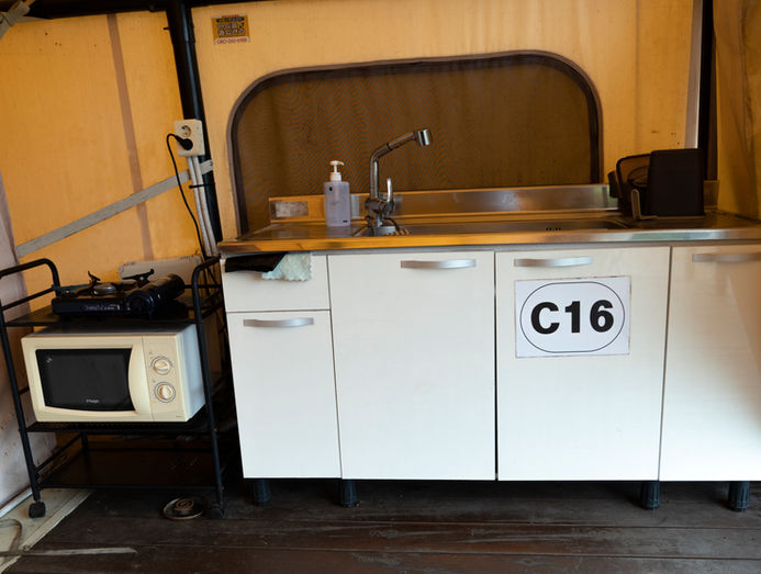 • 타프구성: 개별싱크대, 테이블, 캠핑체어,전자레인지, 전기밥솥,  전기포트, 냄비, 프라이팬,  가스버너,  집게, 가위, 칼, 국자, 뒤집개, 슈저, 소주잔, 컵, 접시, 바베큐그릴 등